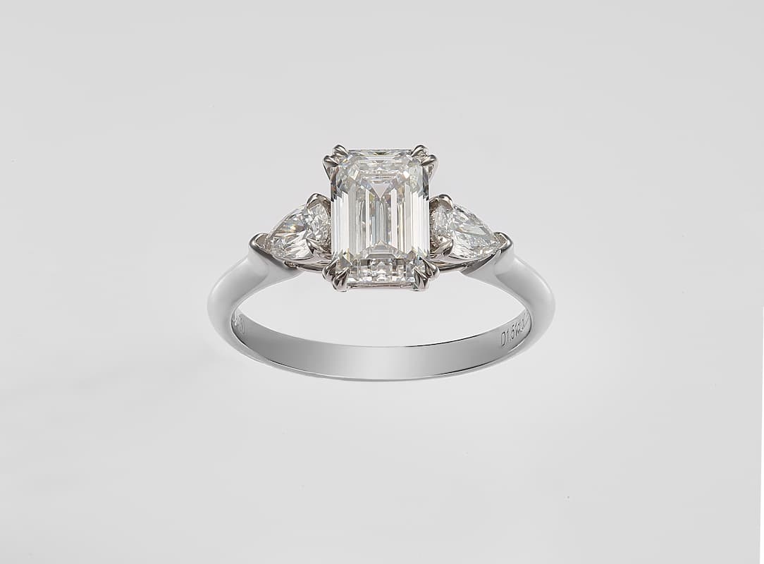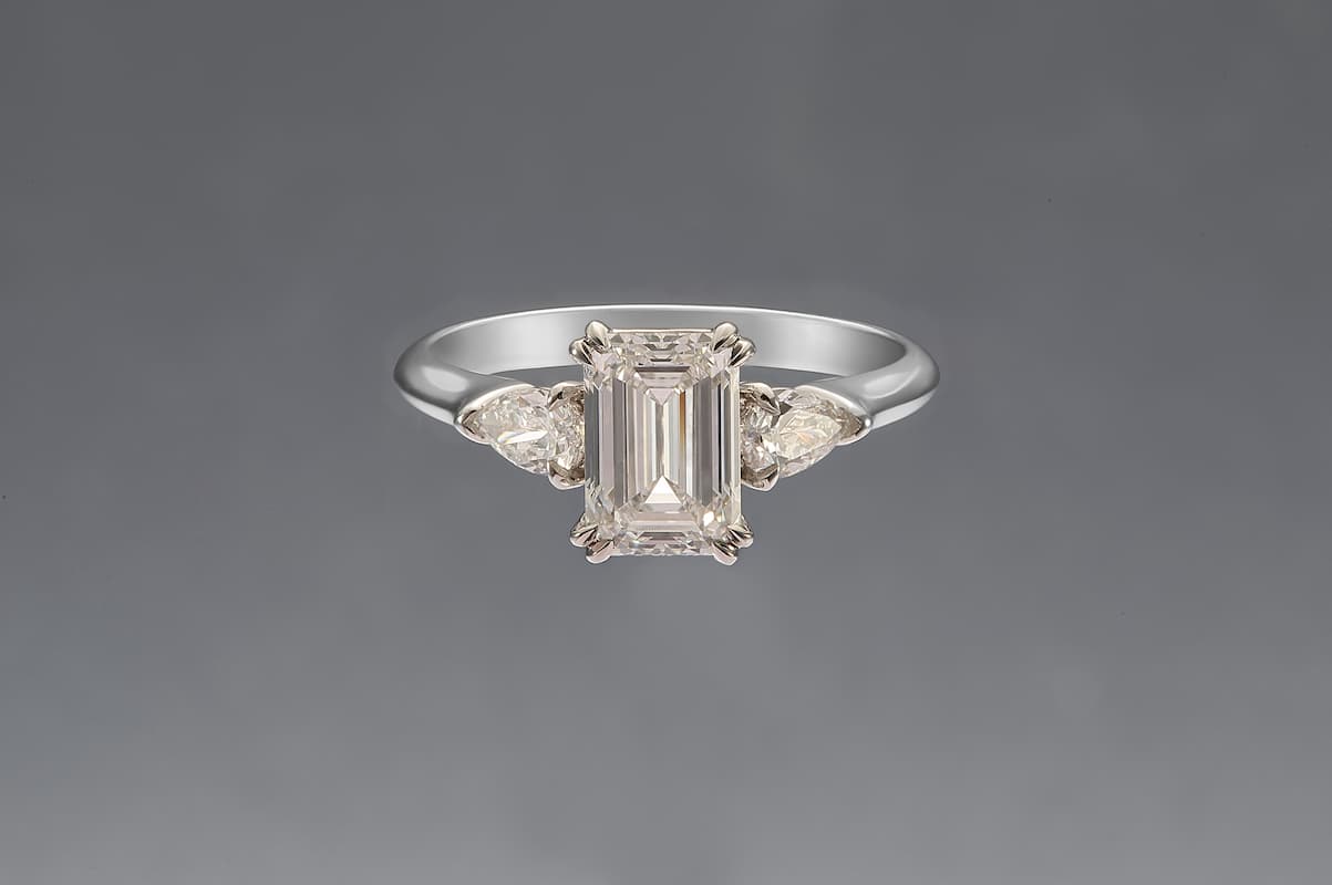This exquisite ring features a prominent emerald-cut central diamond, flanked by two pear-shape diamonds. Set on a sleek band of high-shine white gold finish, the design enhances the brilliance of the diamonds. The ring’s sophisticated and luxurious appearance makes it a perfect choice for significant occasions such as engagements or anniversaries. Its classic yet striking design ensures it will be a cherished piece, potentially becoming a everyday wear. Presented on a ring finger, this ring’s sparkle and elegance are beautifully highlighted.
