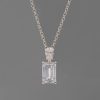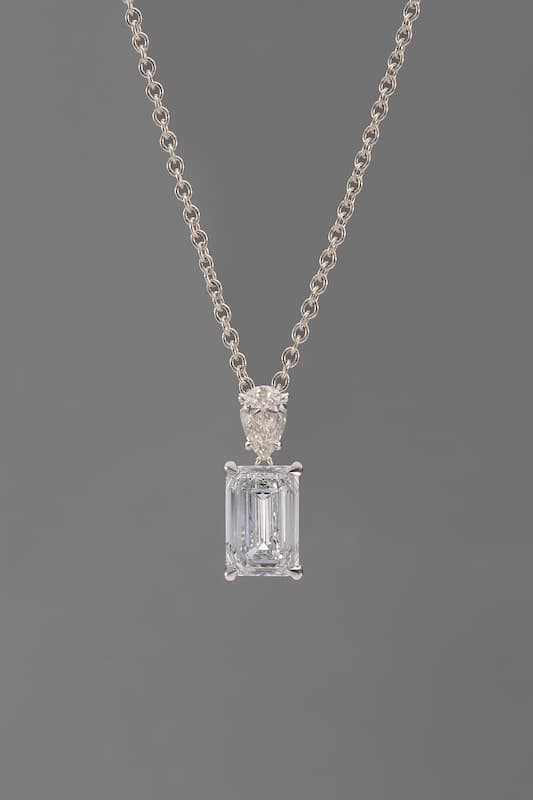 The pendant is a harmonious blend of two distinct diamonds. At the top, a Pear-shape is set in a matching symmetrical pattern adding a touch of sparkle and elegance. Below it, the eye is drawn to a larger, rectangular shape, reminiscent of an emerald cut. This larger stone is meticulously faceted to enhance its brilliance and reflectivity, capturing and reflecting light with every movement.